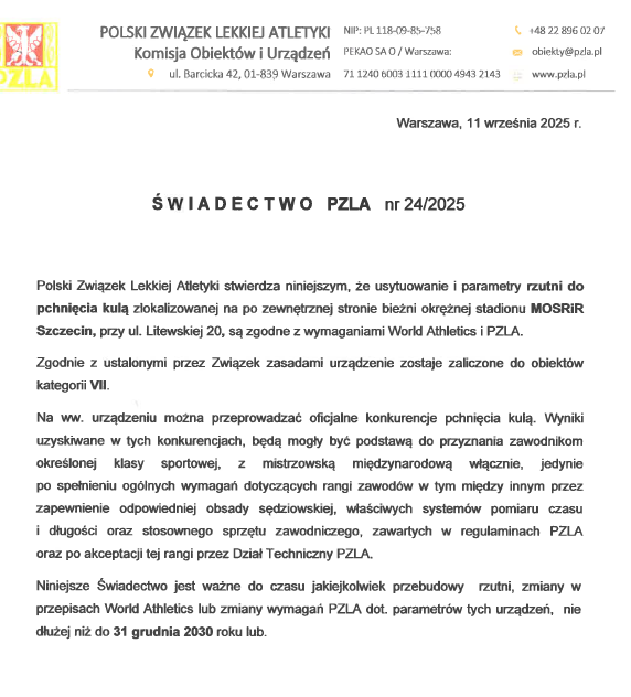 Z radością informujemy, że stadion lekkoatletyczny MOSRiR przy ul. Litewskiej w Szczecinie otrzymał dwa oficjalne Świadectwa Polskiego Związku Lekkiej Atletyki (PZLA):