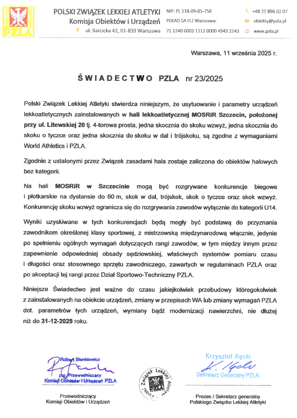 Z radością informujemy, że stadion lekkoatletyczny MOSRiR przy ul. Litewskiej w Szczecinie otrzymał dwa oficjalne Świadectwa Polskiego Związku Lekkiej Atletyki (PZLA):